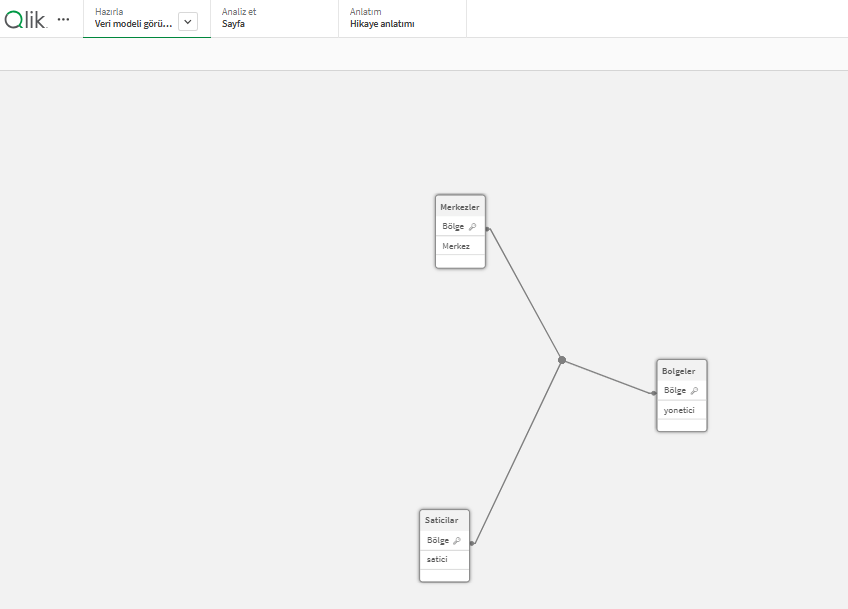 Tüm bağlanacak alan adları ortak olmalı veri setimizi buna göre revize etmeliyiz. Ortaklaştırdıktan sonra veri modelini görüntüle sekmesine basarak ortaklaşmış tabloları bu şekilde görüntüleyebilriz.