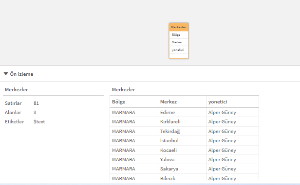 Bu kod, yeni yüklenen tabloyu var olan Merkezler tablosunun altına ekler.