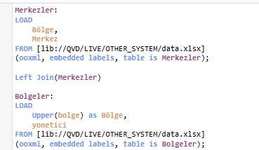 Bu kodda iki tabloyu (Merkezler ve Bölgeler) birleştiriyoruz. Left Join, Merkezler tablosunu ana tablo olarak alır ve Bolgeler tablosundaki eşleşen satırları bu tabloya ekler. Eşleşme Bölge alanı üzerinden yapılır.Bu satır, Merkezler tablosuna Bolgeler tablosunu sola birleştirir. Yani Merkezler’deki her kayıt korunur, Bolgeler’den sadece eşleşenler eklenir.