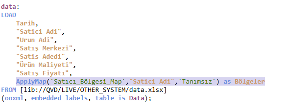 Bu aşamada ApplyMap fonksiyonunu devreye sokuyoruz. Burada dikkat edilmesi gereken önemli bir nokta var: Mapping yaptığımız tablonun adını tek tırnak (‘ ‘) içinde yazmamız gerekiyor. Biz örneğimizde 'Satıcı_Bölgesi_Map' adını verdik ve bu ismi kullanarak mapping tablosunu çağırdık.