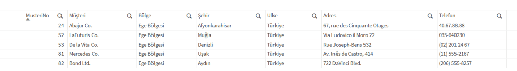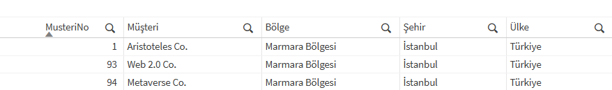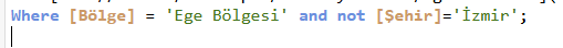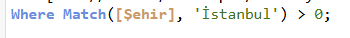 Where Match([Şehir], ‘İstanbul’) > 0;