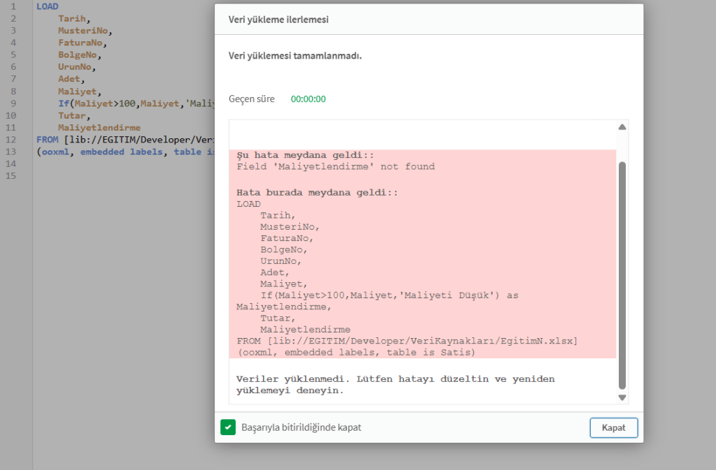 Qlik Sense’te veri modellemesi yaparken bazen bir alana uyguladığımız dönüşümün sonucunu, aynı LOAD deyimi içinde başka bir hesaplamada kullanmak isteriz. Ancak bu durum, Qlik Sense’in çalışma mantığı nedeniyle doğrudan mümkün değildir ve “alan bulunamadı” gibi hatalara yol açar. İşte bu noktada İç İçe LOAD (Nested LOAD) yapısı devreye girer ve bize bu kısıtlamayı aşma imkanı sunar.
